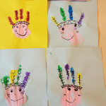 Kurz vor Rosenmontag entstanden mit viel bunter Fingerfarbe, aus Handabdrücken, kleine und große Indianer.