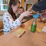 Schließlich wurden Zaubertränke gebraut: Für den ersten Trank, der jemanden in eine Kröte verwandeln kann, wurden geheime Zutaten mit Maden und Spinnen so zusammengemischt, dass es nur so brodelte und schäumte. Natürlich wurde ein Hexenspruch für die richtige Wirkung dazu gesprochen. Nur – niemand hat den Trank probieren und sich in eine Kröte verwandeln wollen. Das Rezept für diesen Trank ist selbstverständlich geheim und darf von den Eingeweihten nur gegenüber sehr bösen Menschen verwendet werden – Hexenehrenwort!
