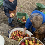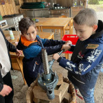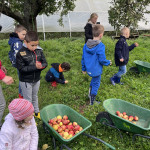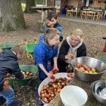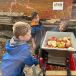 Im Juni war die Löwenklasse bereits auf dem Biohof Rotermund-Hemme in Brelingen. Und weil es so schön war, durften die Löwen im Herbst erneut zu Besuch kommen. Unser Tag auf dem Bauernhof war so super! Die Apfelernte stand an. Im Unterricht hatten wir uns ja schon mit dem Apfel beschäftigt. Aber an dem Tag auf dem Bauernhof durften wir aus Äpfeln Saft pressen. Dafür mussten wir zunächst natürlich Äpfel sammeln. Mit Schubkarren und Eimern ging das richtig gut. Als die Schubkarren voll waren, ging es zu einer großen Wanne mit Wasser. Dort haben die Kinder die Äpfel sauber gemacht. Das machte wirklich allen Spaß. Mit einem Zerkleinerer drehten wir die Äpfel in kleine Stücke. Weiter ging es mit Bechern. Damit wurden die kleinen Apfelstücke in die Presse geschüttet. Und dann wurde gepresst, bis der Apfelsaft rausfloß! Alle haben so toll mitgemacht. Den Apfelsaft durften duften wir natürlich probieren. So lecker!