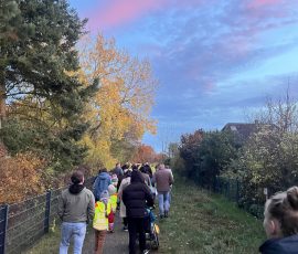 Zum Sonnenuntergang machten wir uns mit unseren vorher gebastelten Laternen auf den Weg. „Rote, gelbe, grüne, blaue…“ wunderschön leuchteten sie bei unserem kleinen Umzug. Begleitet von Gitarrenspiel sangen wir beim Laufen Laternenlieder bis es dunkel wurde. Es war ein schönes Fest und wir bedanken uns bei allen Eltern für ihr Kommen.