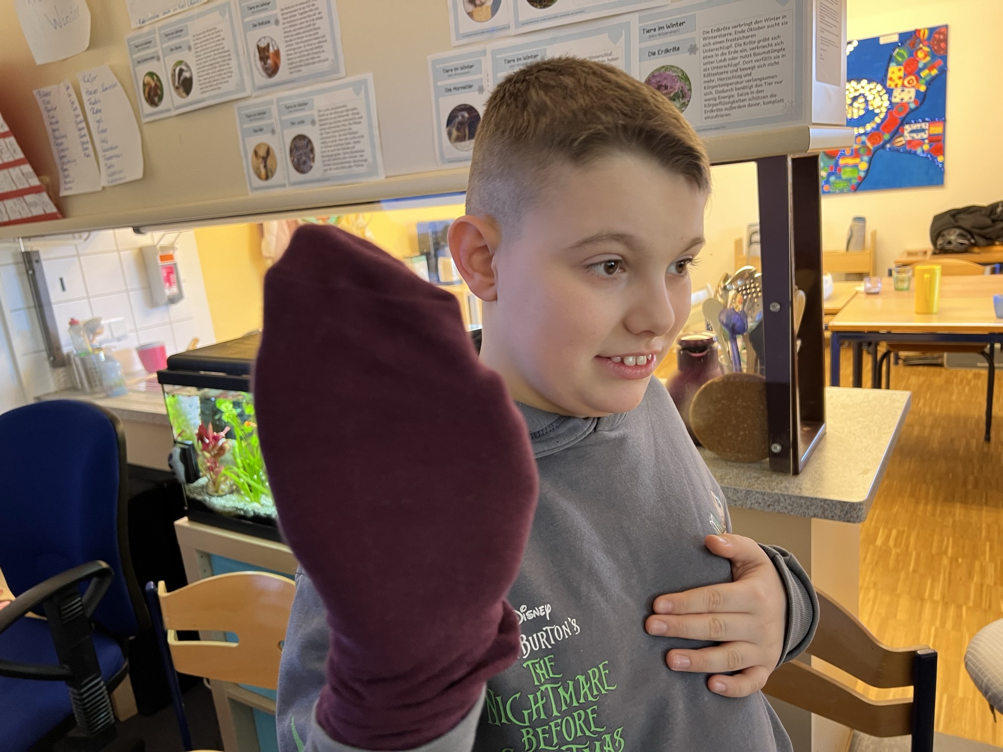 Unsere Projektgruppe bestand aus den Schüler:innen Raphael, Michail, Gentian, Metehan, Moritz und Sümeyra. Am Dienstag haben wir zuerst das Muppetshow Lied auf dem „Riesenhandy“ angeschaut, sowie das Lied“ Mahnah mahnah“. Dann ging es los mit dem Basteln von unseren Sockenpuppen. Mit Wackelaugen, Puscheln, bunter Wolle, Perlen, Knöpfen und Füllwolle haben wir bunte Handpuppen gebastelt. Das hat allen viel Spaß gemacht und es sind zauberhafte Puppen geworden. Am Mittwoch und Donnerstag haben die Schüler:innen mit ihren Handpuppen zu unterschiedlichen Musikstilen hinter unserer Puppenbühne getanzt, miteinander kommuniziert, gesungen und witzige Bewegungen geübt. Auch kleine Sketche von der Muppetshow haben wir uns angeschaut.