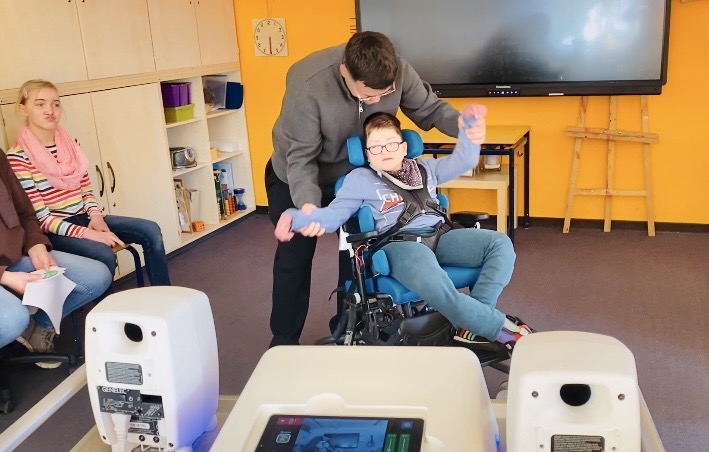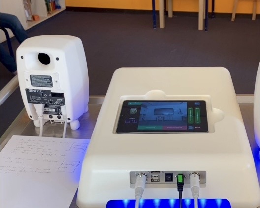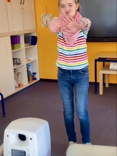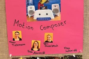 Fünf Schülerinnen und Schüler hatten in dieser Gruppe die Möglichkeit, ganz vielfältig den schuleigenen Motion Composer auszuprobieren, ein Gerät, dass Bewegungen in Klänge umwandelt. Je nach Einstellung kann man über Körperbewegungen Klänge und Melodien von verschiedensten Instrumenten erzeugen, aber auch Tierstimmen oder Quatschgeräusche lassen sich durch Bewegungen aktivieren.