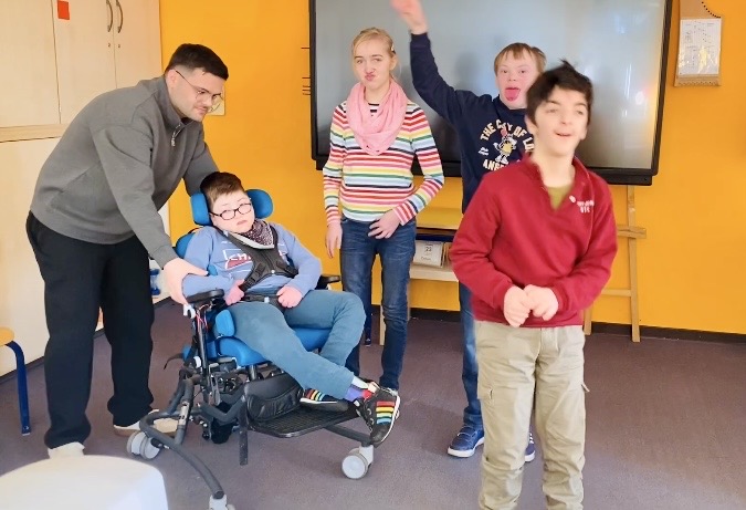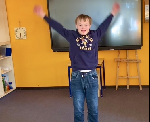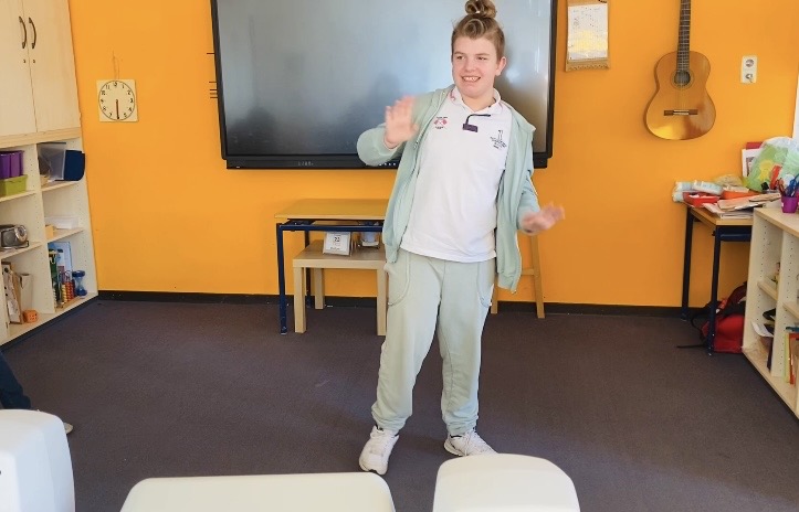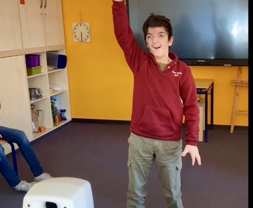 Lea, Lennox, Arian, Jarno und Koray probierten alleine, zu zweit oder in der Gruppe aus, wie sie Melodien und Geräusche verändern, je nachdem wie sie sich bewegen und wurden so zu richtigen Komponisten. Dabei gab es ruhige und wilde, laute und leise Klänge, Klänge zum Tanzen und Klänge zum Entspannen und auch einigen lustigen Quatsch. Als Abschluss wurde eine Geschichte über einen Bauern erzählt, der die verschiedenen Tiere auf seinem Hof und schließlich sogar einen Löwen trifft. Die Schülerinnen und Schüler erzeugten die passenden Geräusche dazu; dies erforderte teilweise richtig Konzentration, hat aber auch sichtlich viel Spaß gemacht.