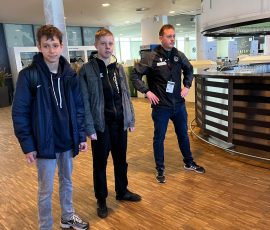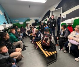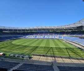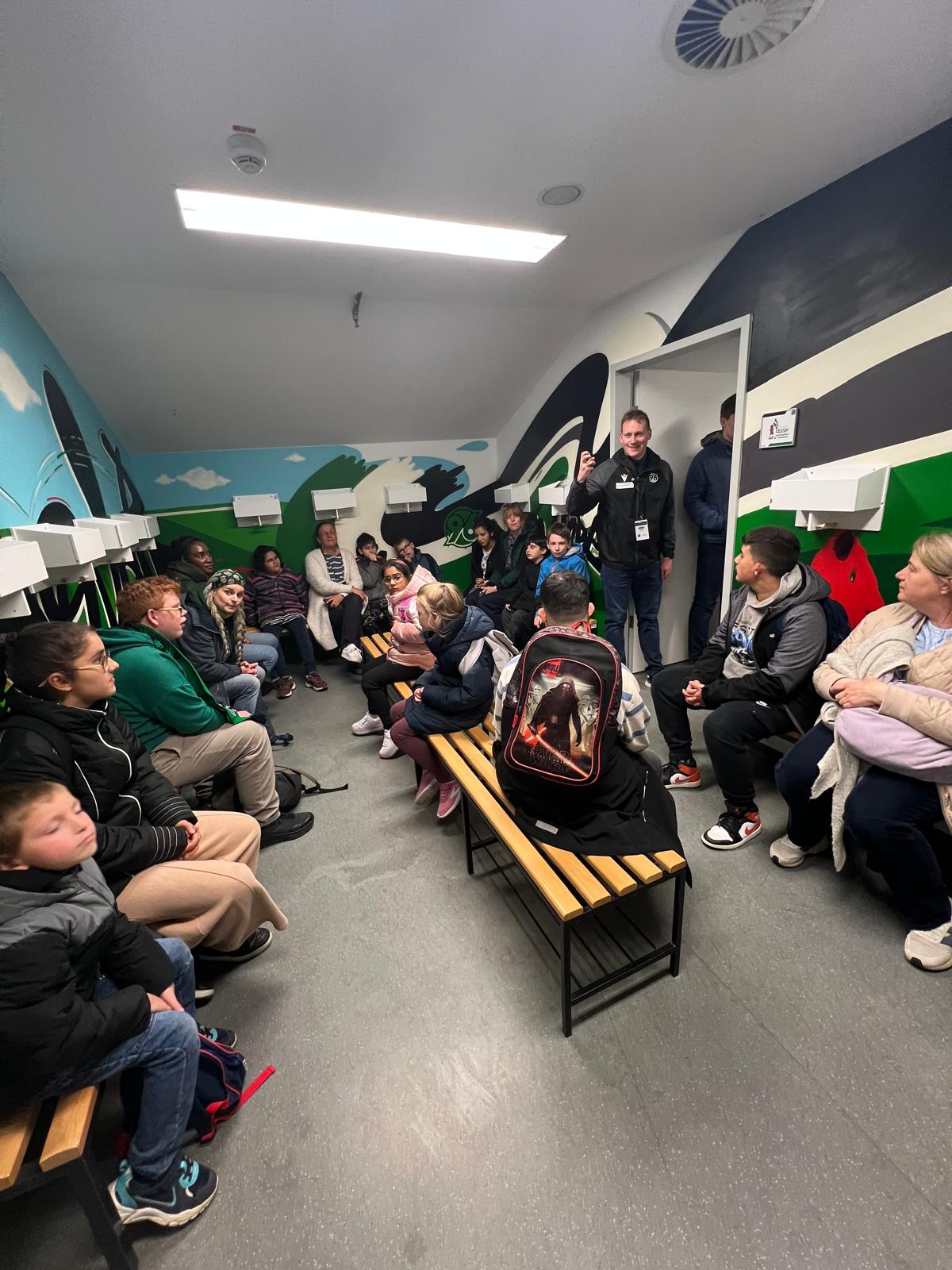 Beim Stadion angekommen, nahm uns dann Marcel in Empfang. In den folgenden 90 Minuten, plus Nachspielzeit, zeigte er uns zuerst die VIP-Lounge und den Logen-Bereich. Nachdem wir von oben einen Blick ins Stadion werfen konnten, ging es nach unten. Wir durften in die Gästekabine. Die war nicht sehr groß und auch nicht schön gestaltet. Der Gegner kriegt keinen Luxus. Die Einlaufkinder schon! Deren Kabine sah toll aus und war schön gestaltet. In der Gästekabine konnten wir auch den Duschbereich sehen. Dort hat es gestunken und da standen auch Mikrowellen, um die Fußballschuhe vor den Spielen aufzuwärmen. Durch den Presseraum ging es weiter zum Spielfeld. Wir durften zwar nicht auf den Rasen, aber es war toll mal ganz unten zu stehen. Marcel hat uns noch erzählt, dass der Rasen eine eigene Heizung hat und das sich 10 Leute um den Rasen der Plätze im Stadion und auf dem Trainingsbereich kümmern. Zwei Mal im Jahr wird der Rasen ausgetauscht. Dann kommen Lkw´s aus den Niederlanden und bringen neuen Rollrasen.